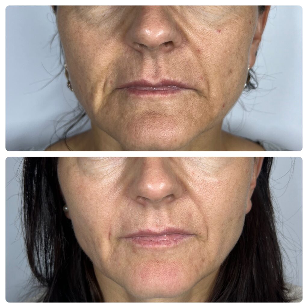 - Poprawa jędrności i struktury skóry – Powstałe nici tworzą trwałą i odporną na obciążenia strukturę podskórną, która poprawia napięcie, podnosi kontury twarzy i przywraca skórze młodzieńczą sprężystość.
